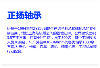 始建于1994年的ZYZ公司是生產滾子軸承和球軸承的專業制造商,地處上海與杭州之間的錢塘江畔。公司建筑面積3.5萬平方米,擁有4個廠?區,員工500名,其中工程技術人員30余名。年產外徑Φ30-360mm的各類軸承1000余萬套,為電機、卡車、汽車、農機、精密機床、工程機械等行業配套。